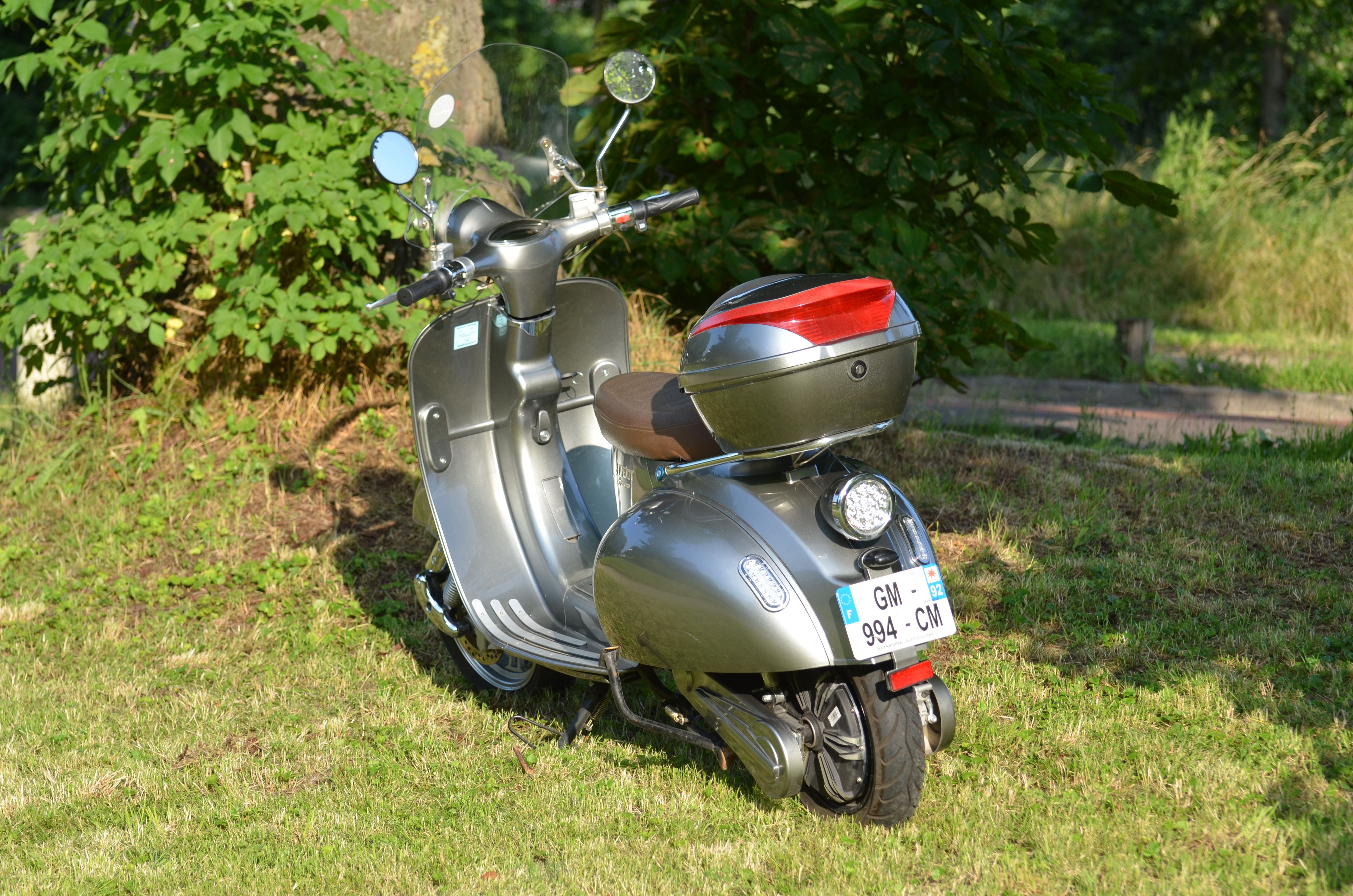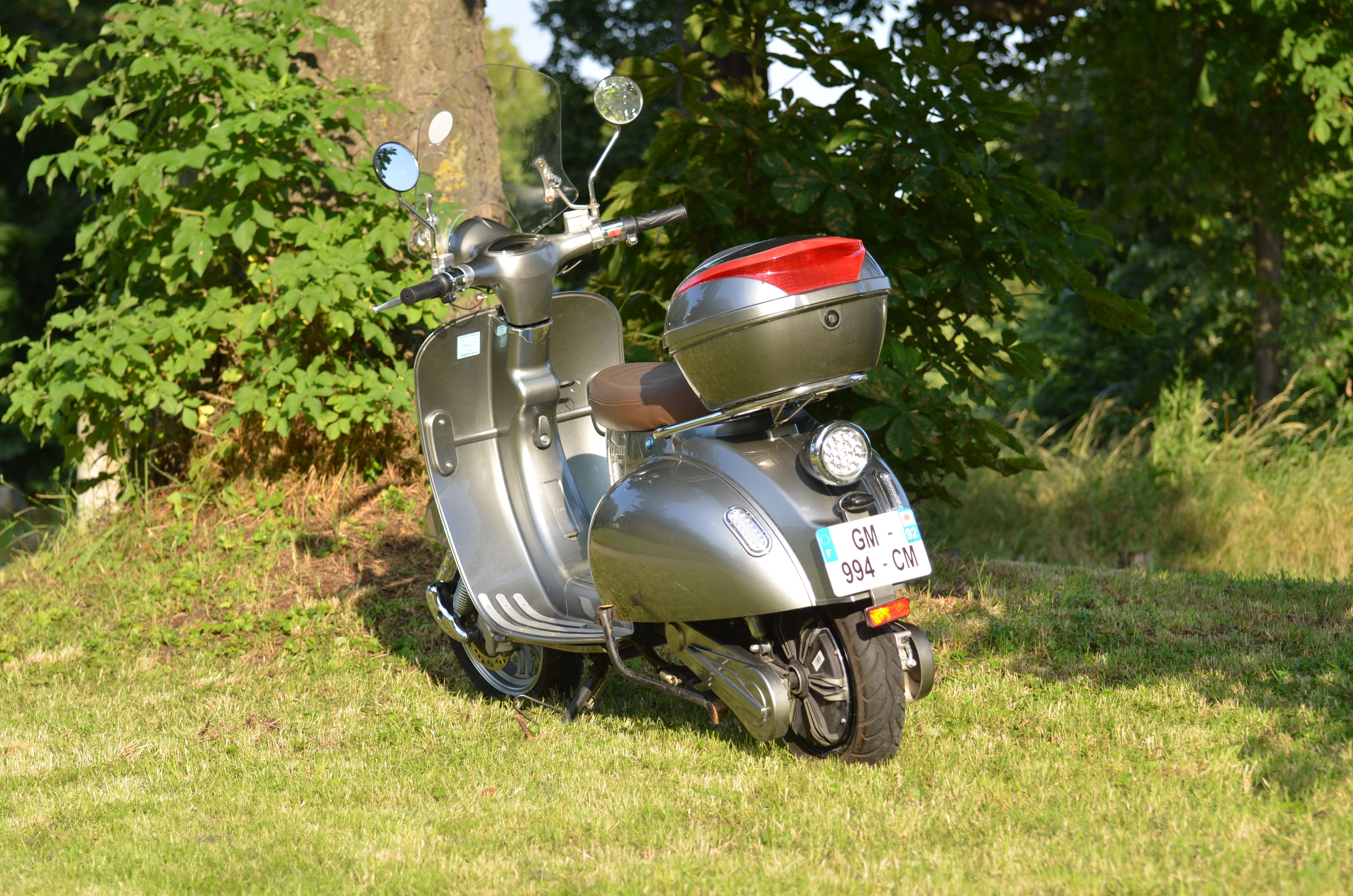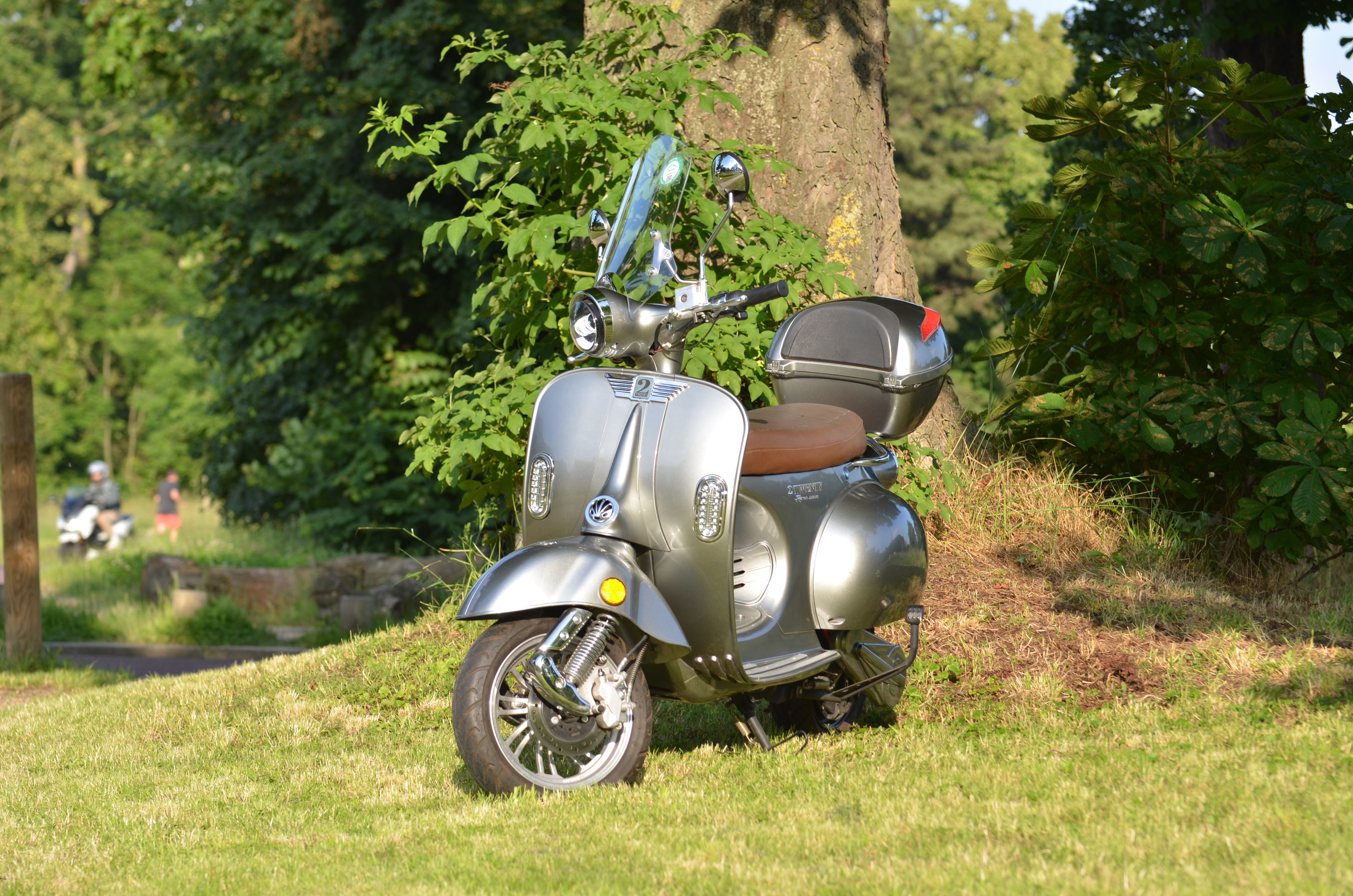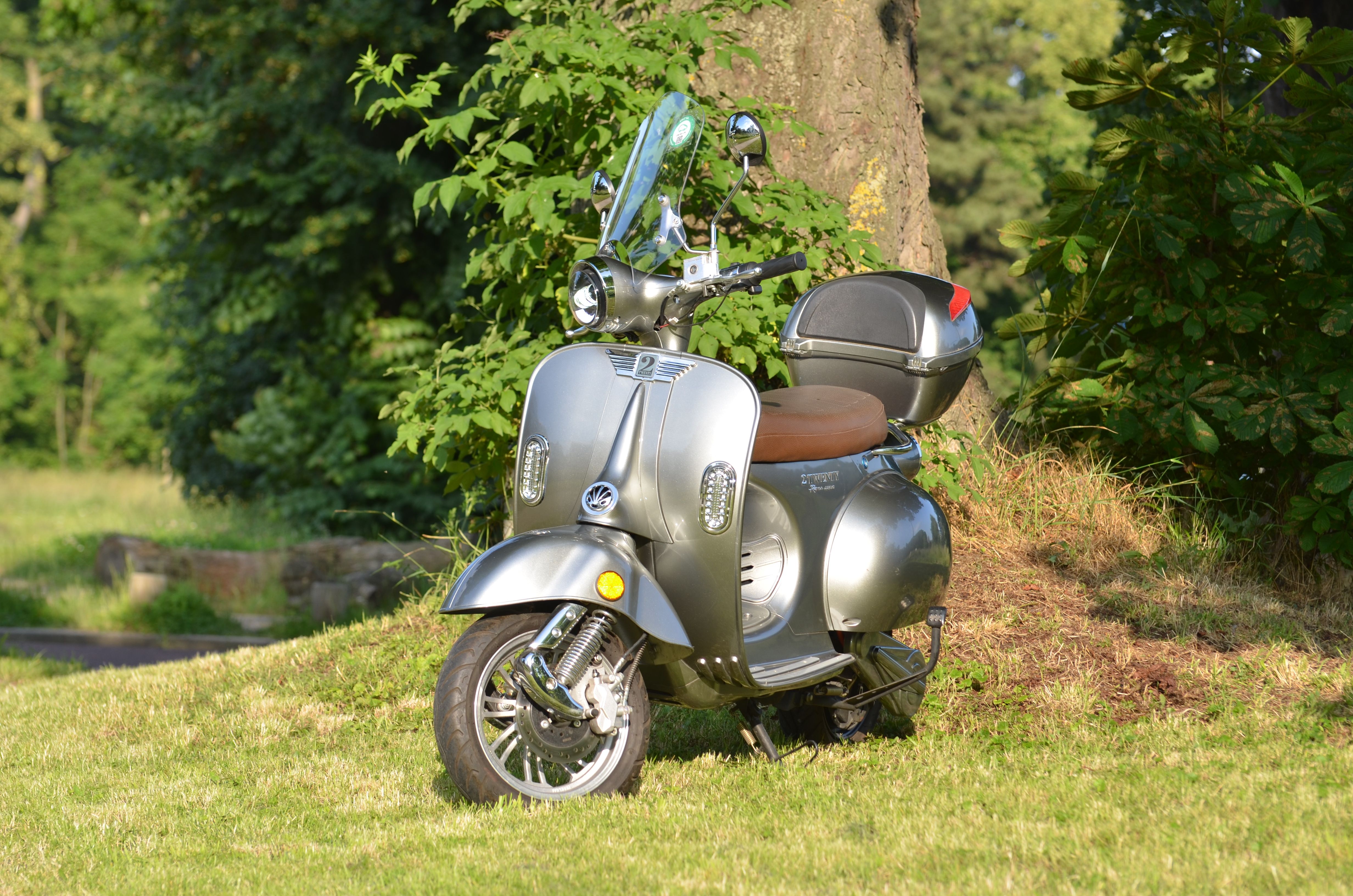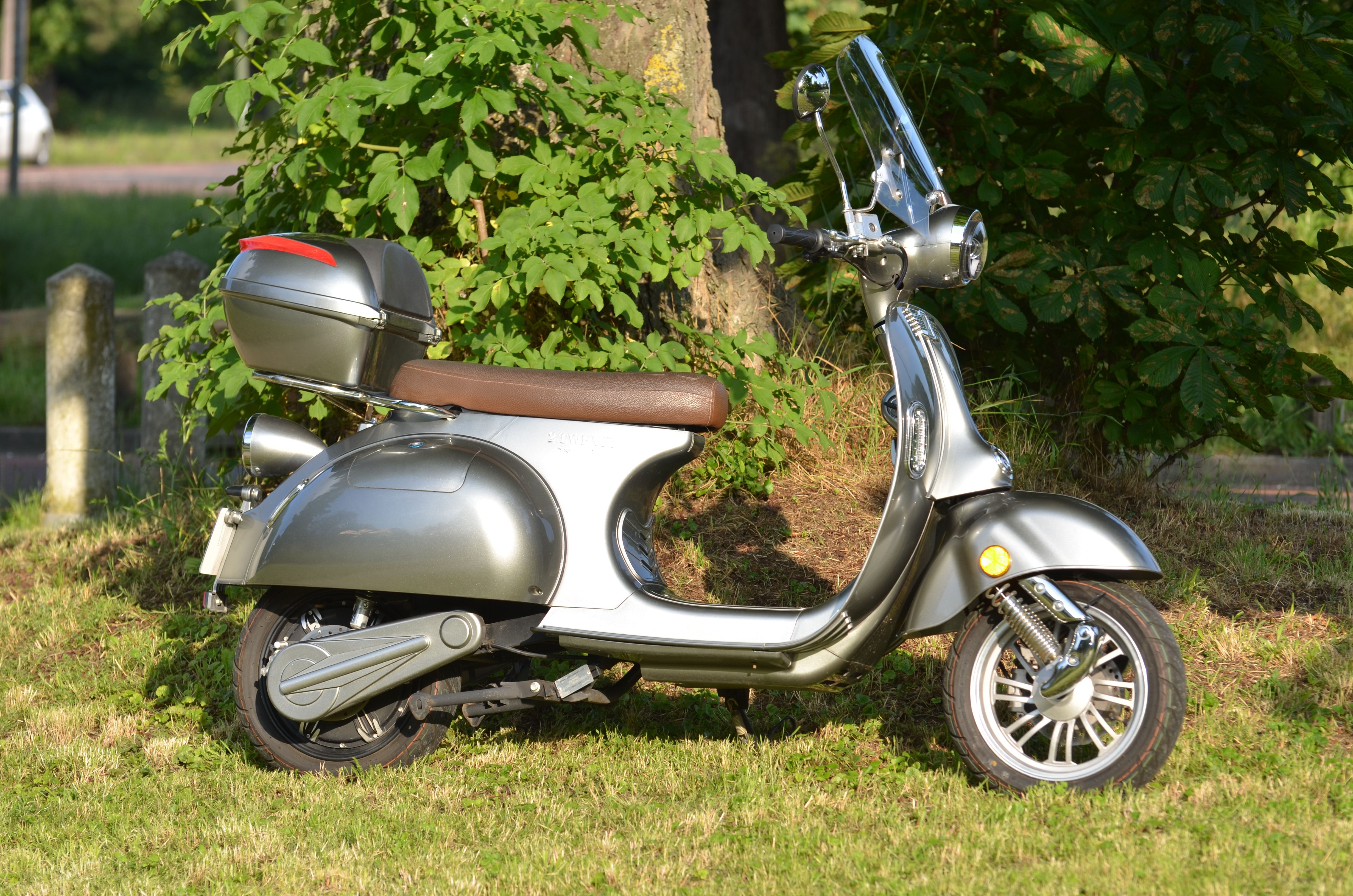 Scooter électrique au look rétro 2 Twenty 4800 Roma (équivalent 125 cc) 10/02/2023, gris métallisé, top case, bulle, jupe, 3 modes de conduite, +/- 80 km d'autonomie, 2 batteries