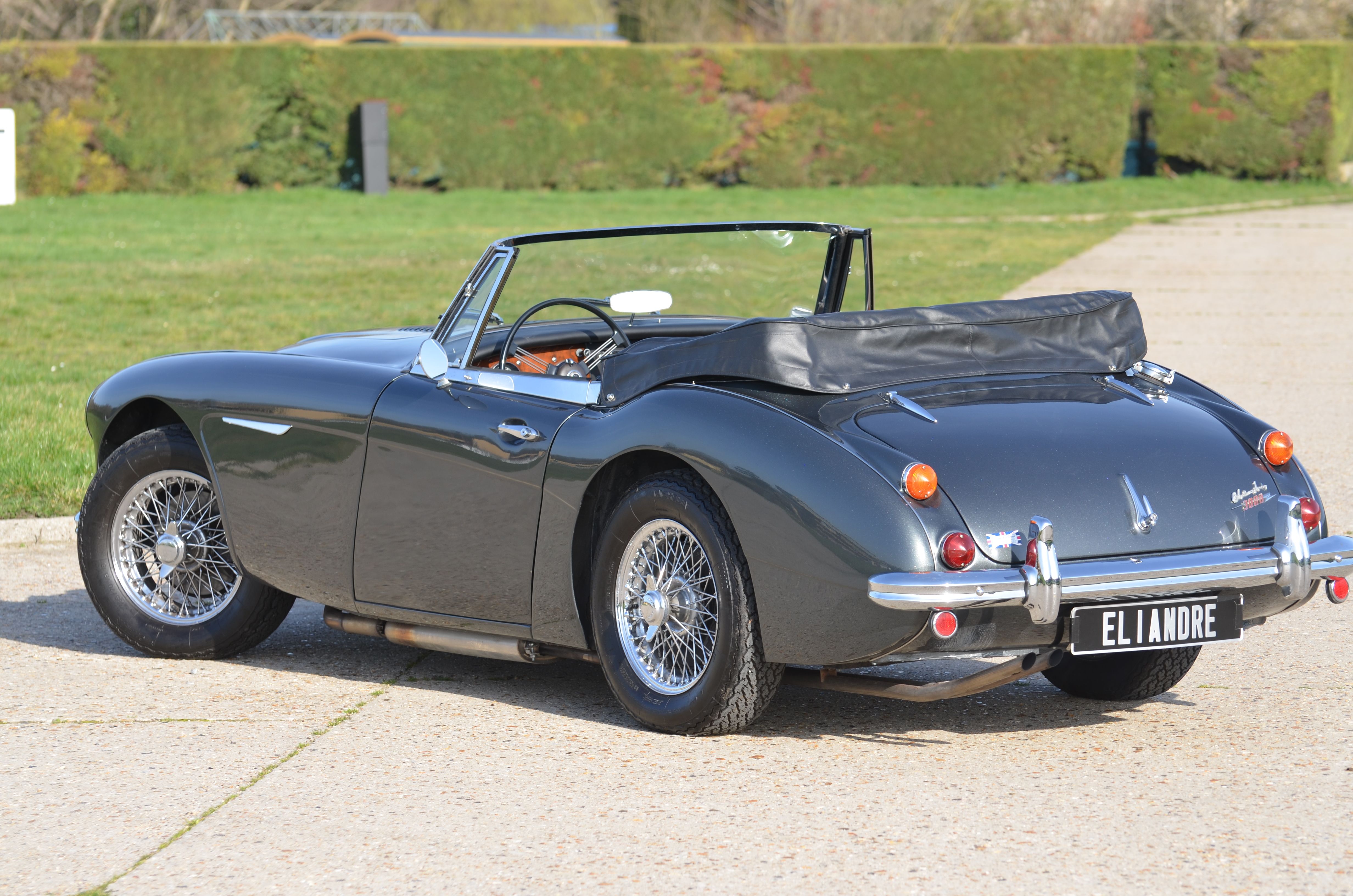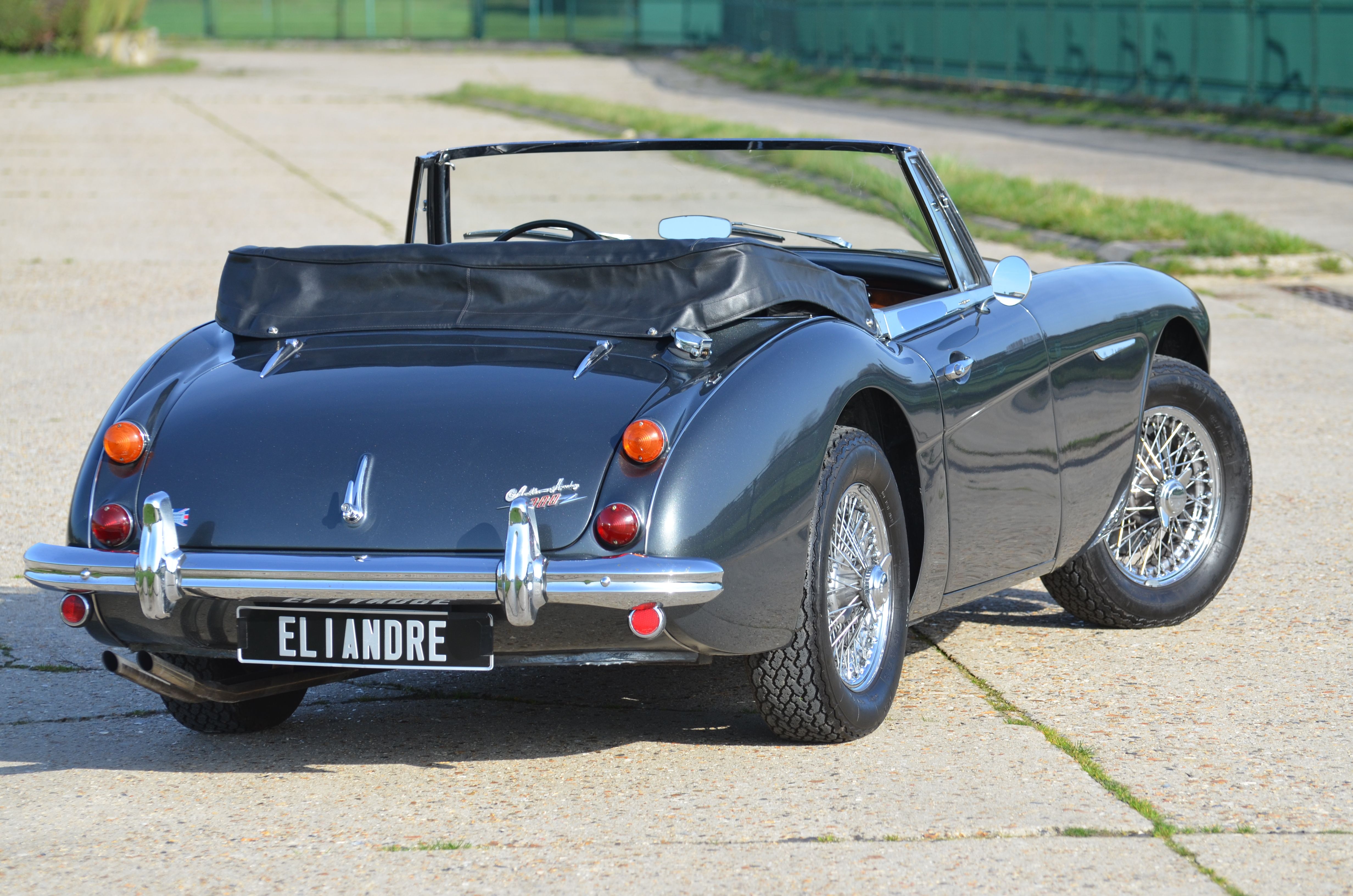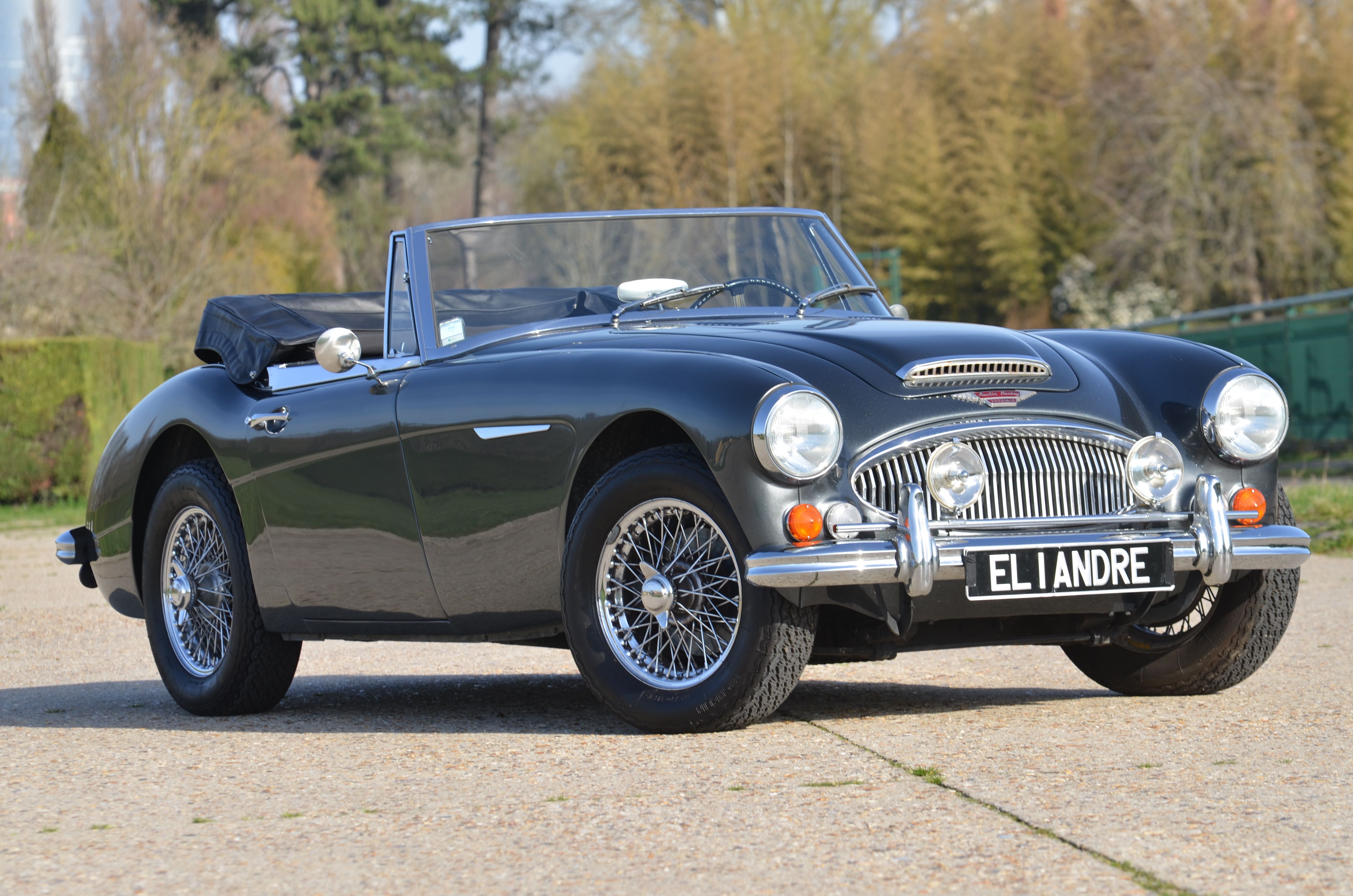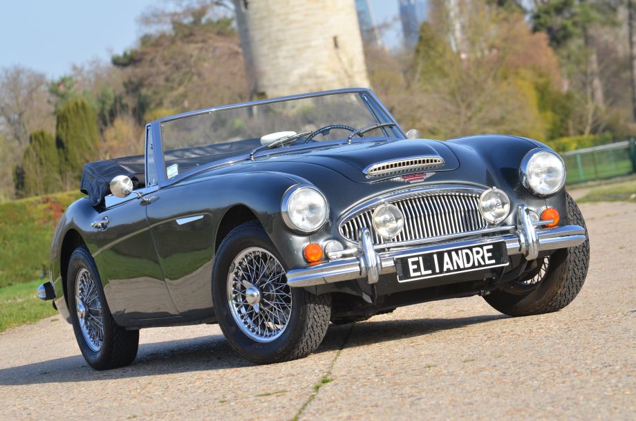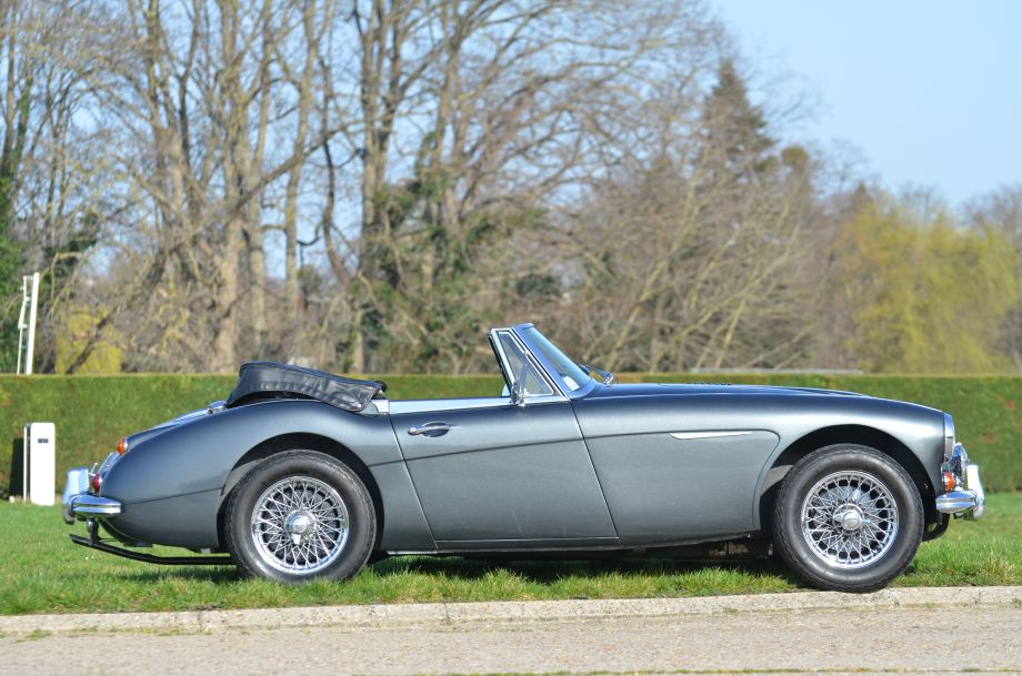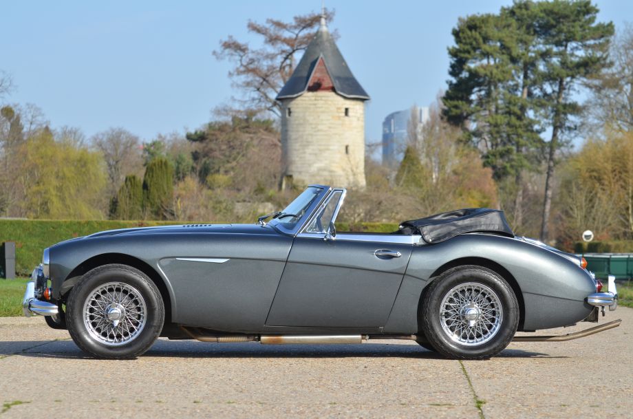 Magnifique Austin Healey BJ8 3000 MkIII date de 1ère mise en circulation 1965, gris Tungsten, sellerie cuir noir, capote noire, roues à rayons, boite de vitesse à 4 rapports + overdrive, dossier de factures d'entretien très complet, voiture de collection en parfait état.