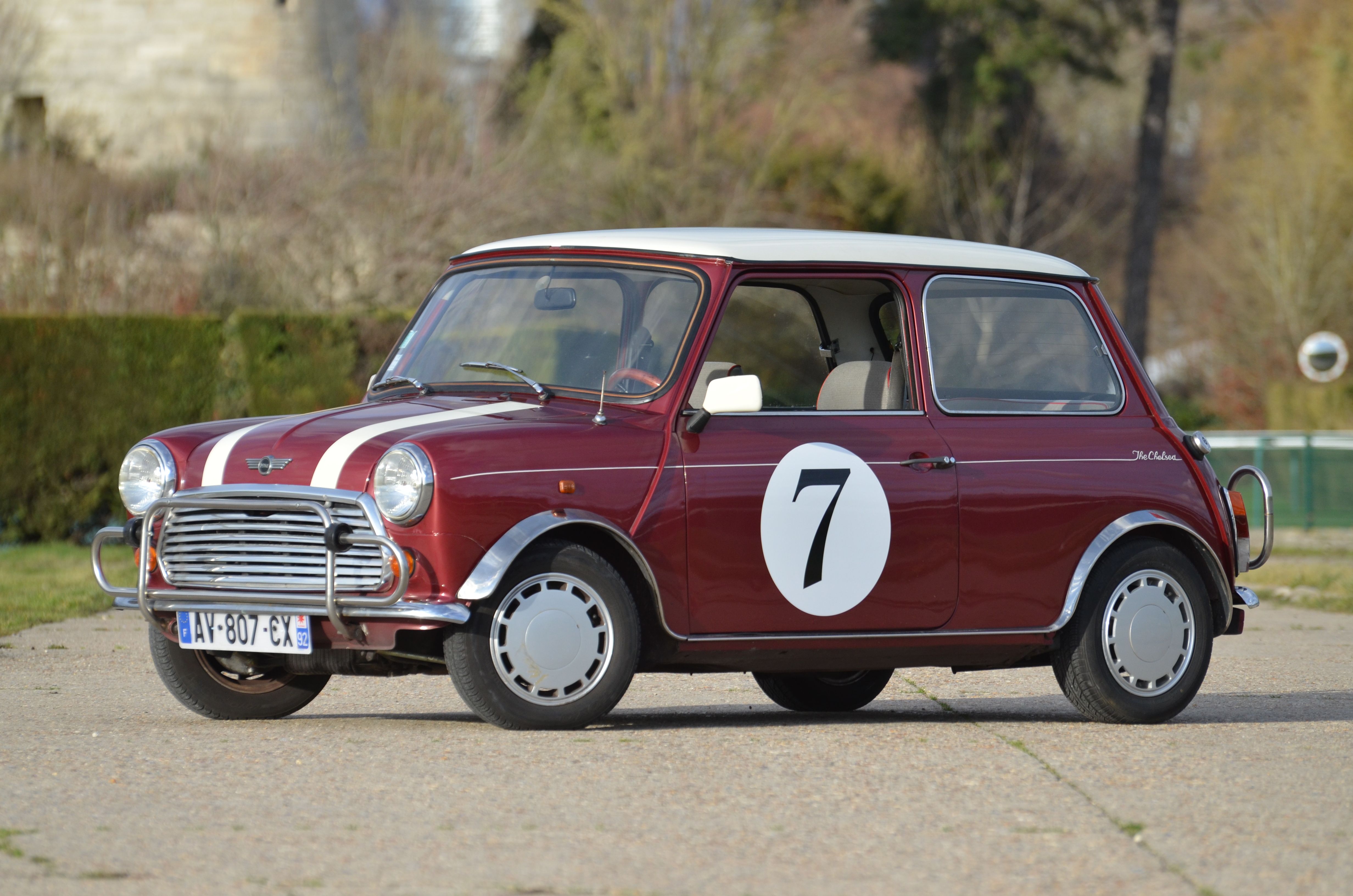 Mini Special "The Chelsea" type XL2S10 livrée en juillet 1986, carrosserie teinte bordeaux, sellerie velours gris, série limitée à 1500 exemplaires, jantes en alliage 12", moteur 998 cm3, 42 ch, boite de vitesse à 4 rapports, cette petite Mini est charmante, juste un petit travail a effectuer sur la peinture au niveau de la baie de pare brise.