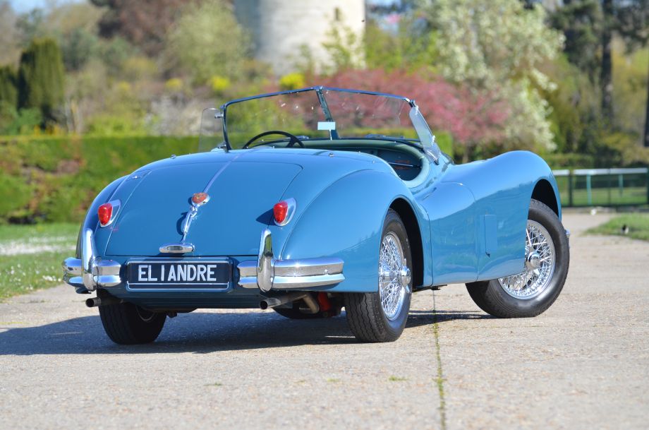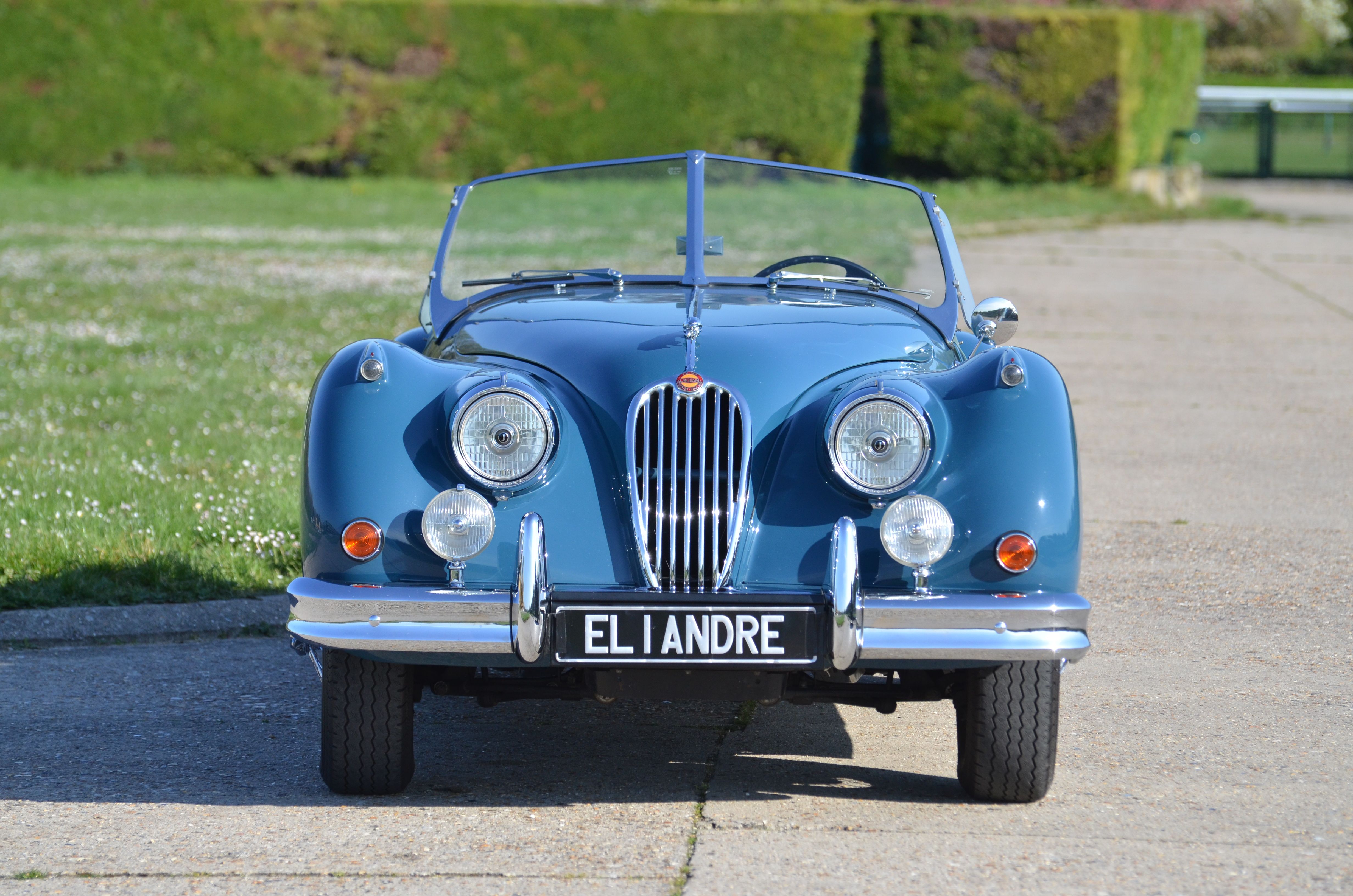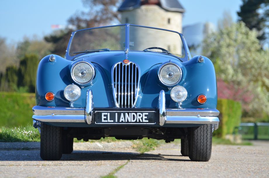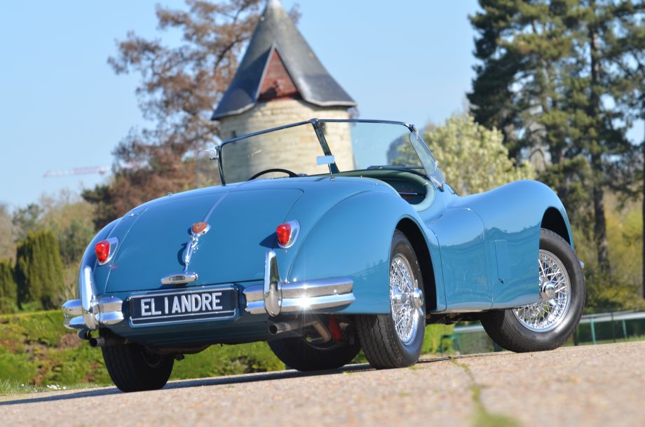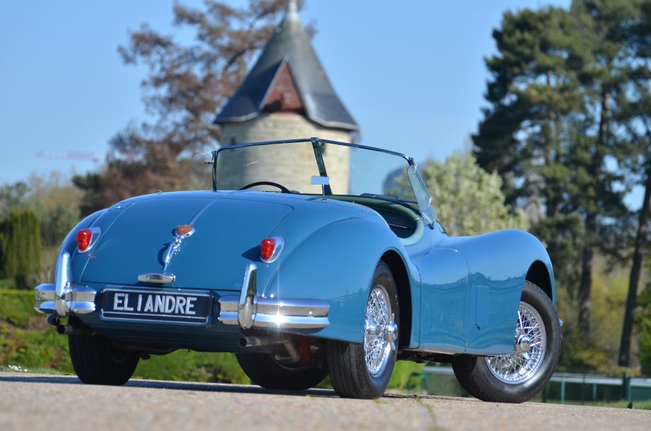 Sublime Jaguar XK 140 OTS SE livrée neuve en 1957 de couleur Costwold Blue; cette sportive de luxe anglaise est un des 8884 exemplaires produit par la firme,anglaise de Coventry entre 1954 et 1957.