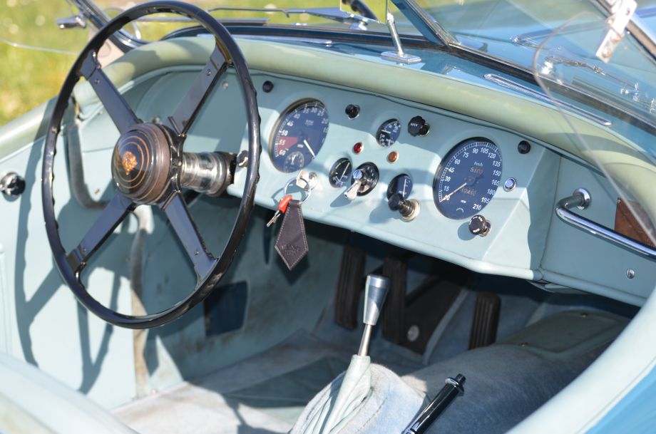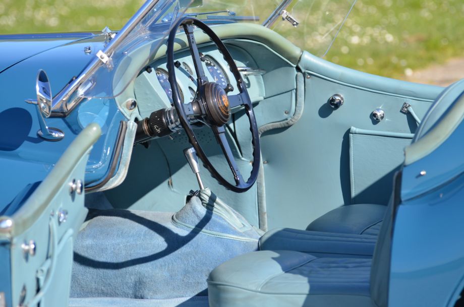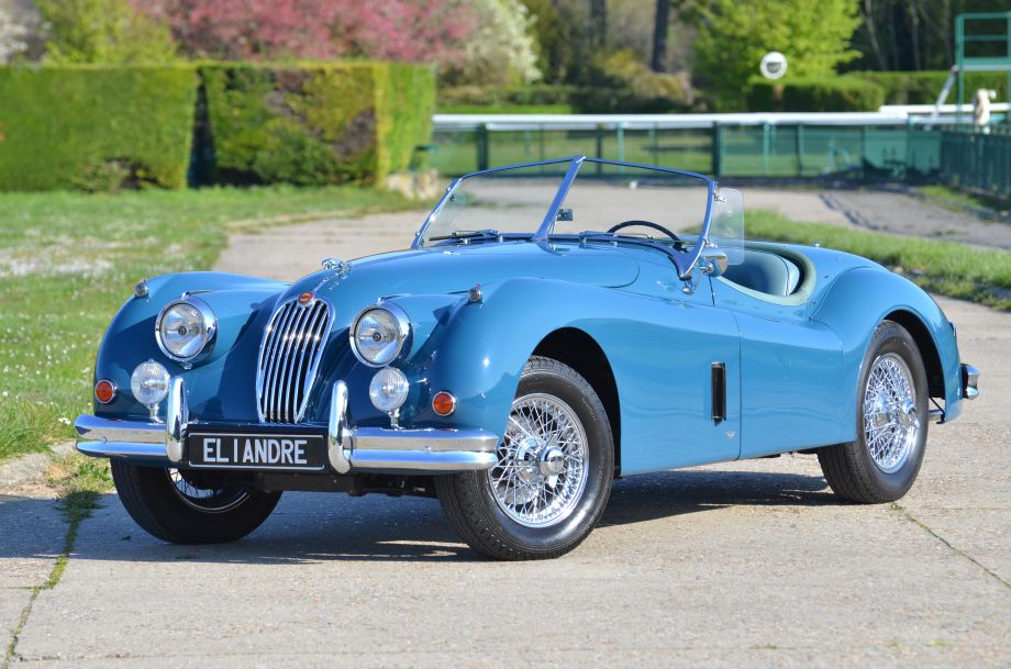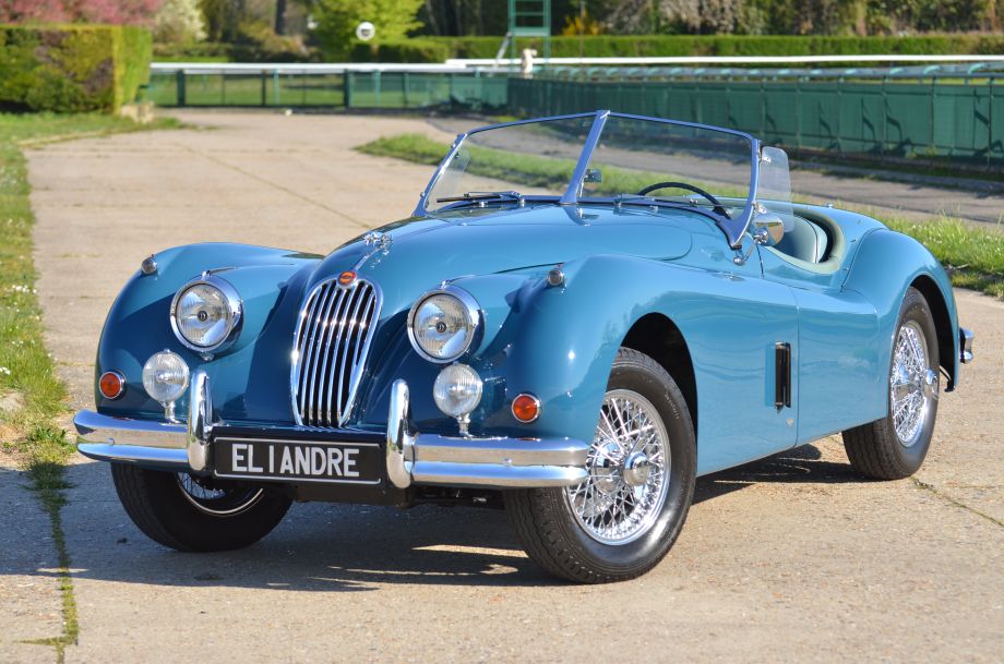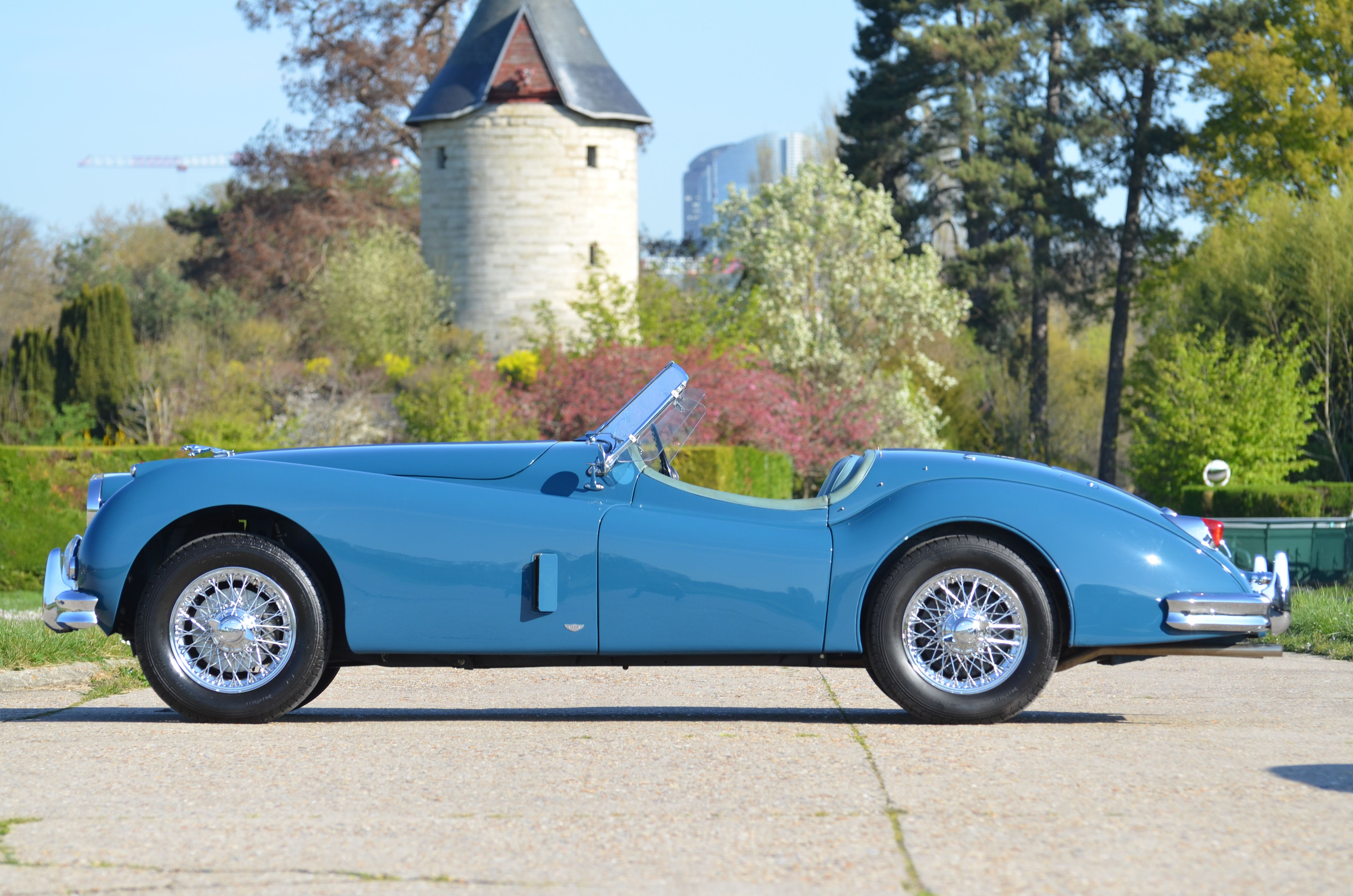 Sublime Jaguar XK 140 OTS SE livrée neuve en 1957 de couleur Costwold Blue; cette sportive de luxe anglaise est un des 8884 exemplaires produit par la firme,anglaise de Coventry entre 1954 et 1957.