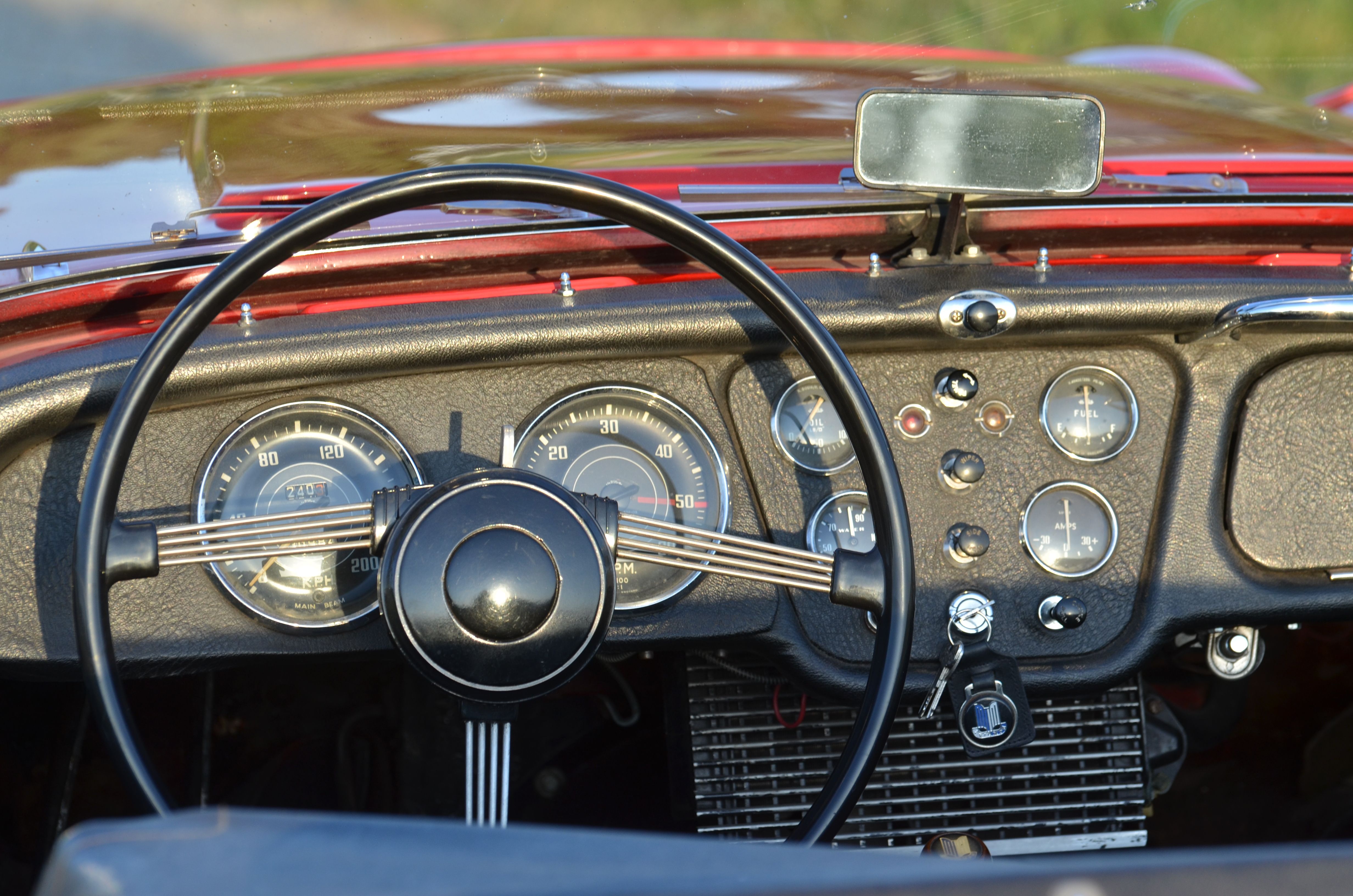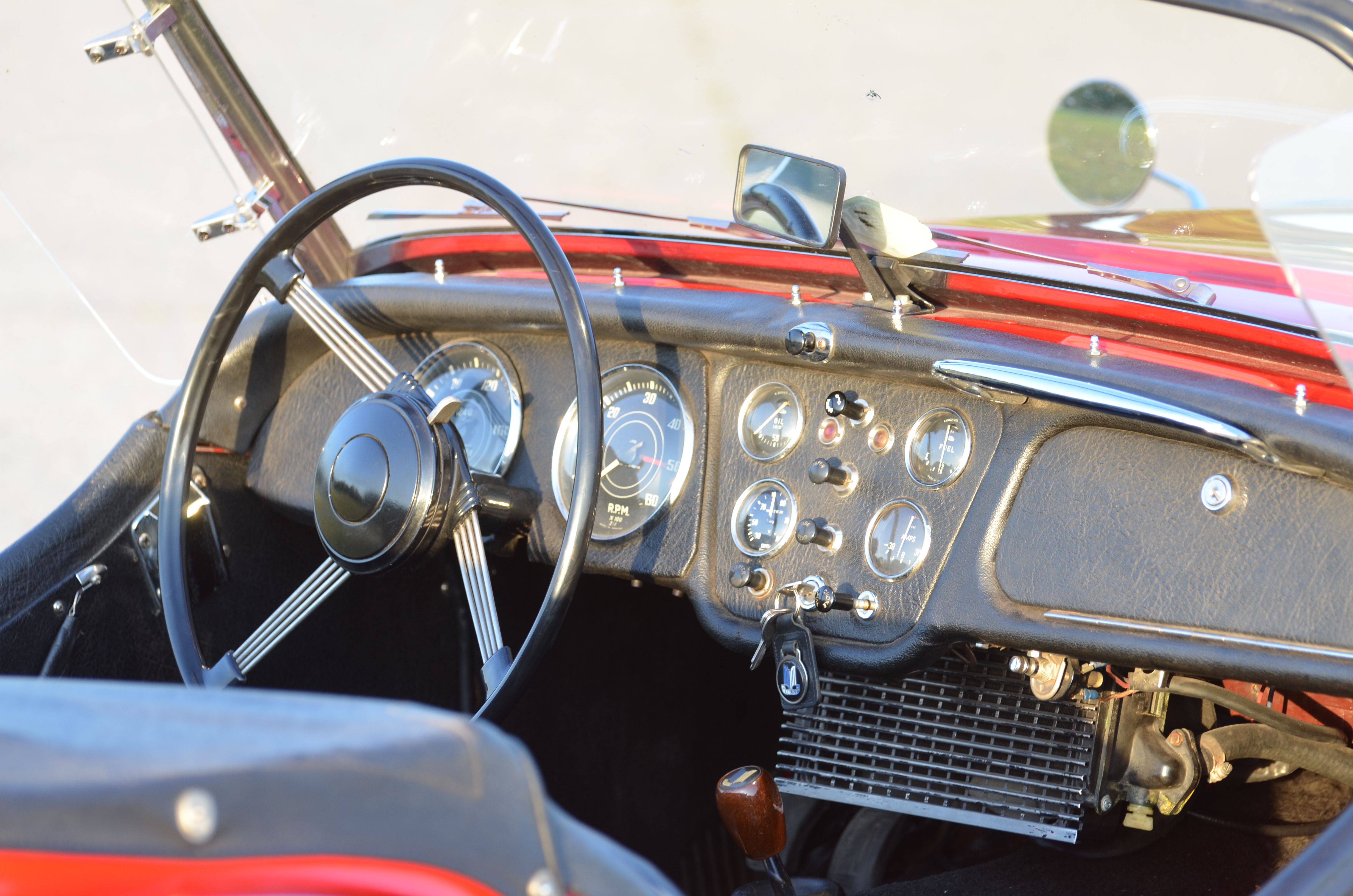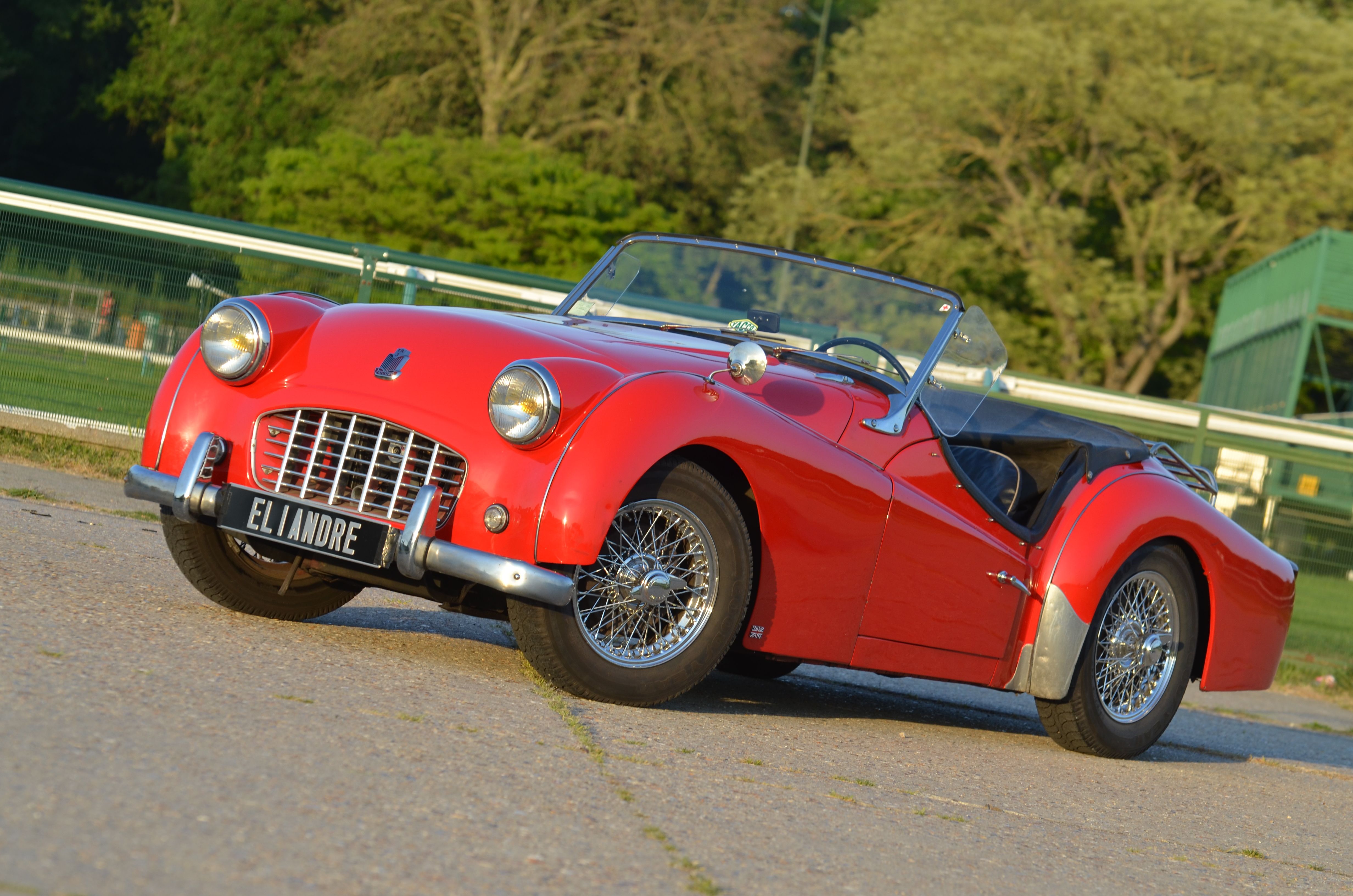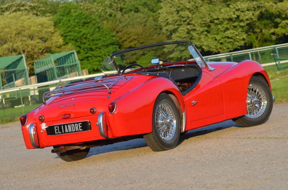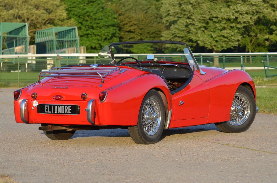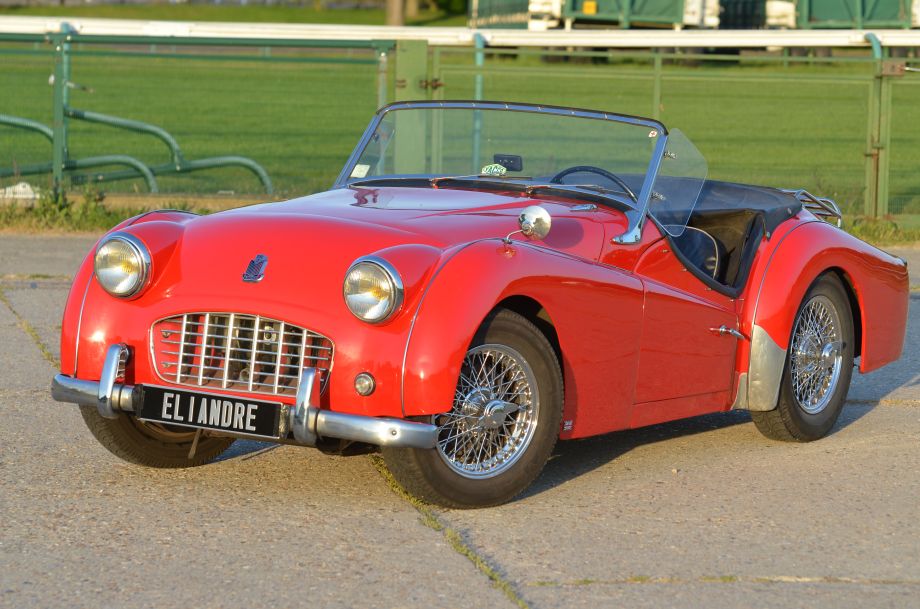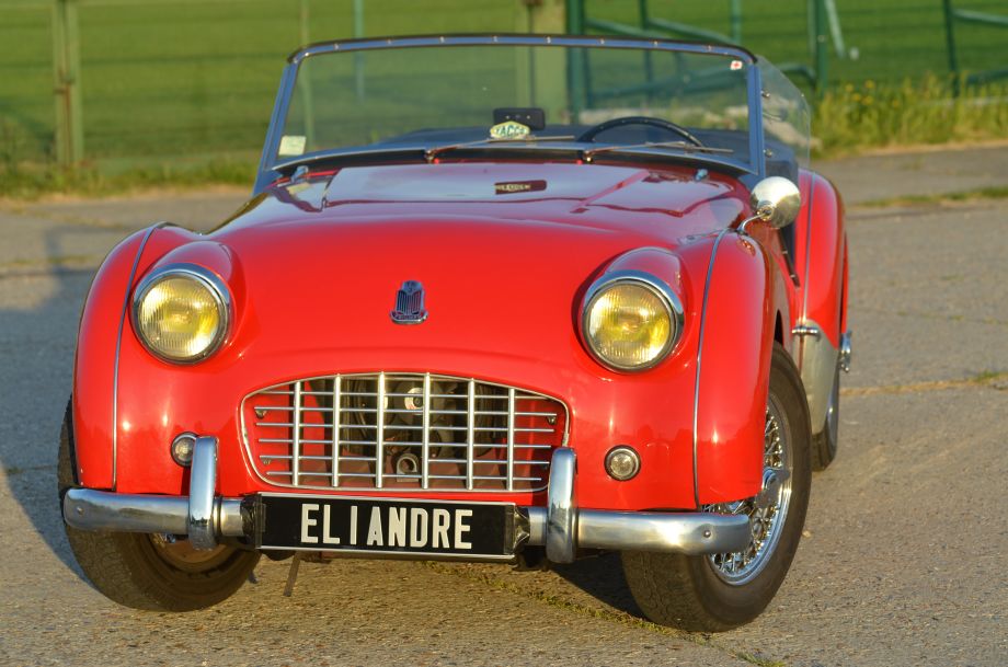 Triumph TR3 1957, rouge, sellerie simili cuir noir, capote noire, voiture avec certificat d'immatriculation français "véhicule de collection".